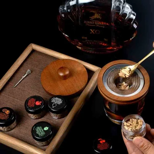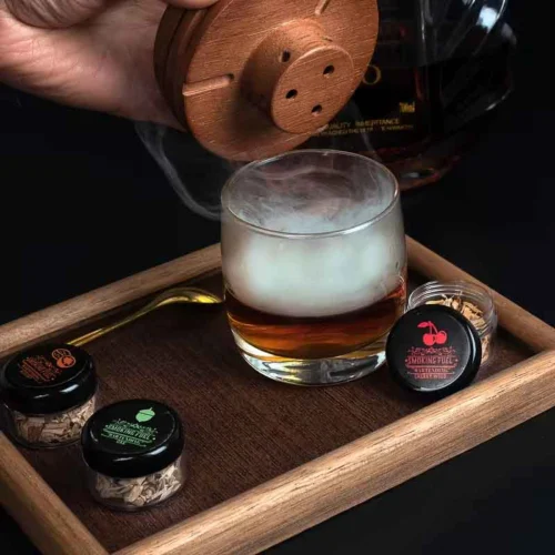 De rookset bestaat uit een houten rookdeksel met geïntegreerd metalen filter, ontworpen om perfect op standaard whiskyglazen te passen. Door een kleine hoeveelheid houtsnippers te verhitten, wordt de rook rechtstreeks in het glas geleid, waar deze zich bindt aan de aroma’s van de drank. In de set zitten 5 houtsoorten, een lepeltje, borsteltje en de juiste aansteker.