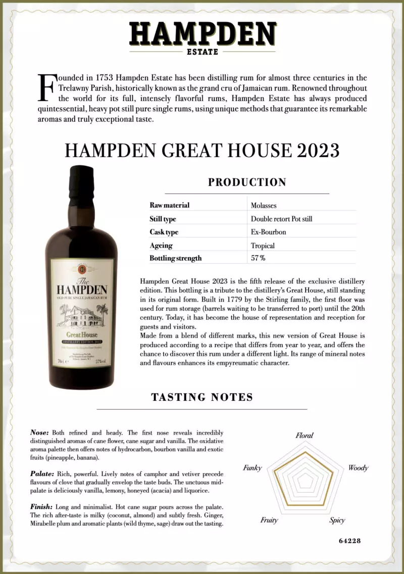 Deze rum wordt geproduceerd op de Hampden Estate in de Trelawny Parish, Jamaica. Deze regio staat bekend om zijn vruchtbare grond en ideale klimaat voor de teelt van suikerriet, wat resulteert in suikerriet van uitzonderlijke kwaliteit.