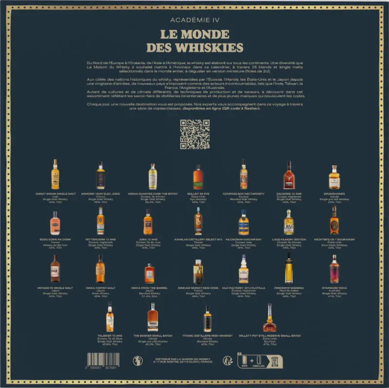 Casa N°7 presenteert een nieuwe whisky adventskalender voor 2025. Ga mee op een 25-daagse whiskywereldreis en leer dankzij de uitleg van de experts in de masterclasses! Deze luxe whisky degustatie adventskalender brengt vijfentwinig blends en single malts samen die van over de hele wereld zijn geselecteerd en die u in miniatuurversies kunt proeven. Proef elke dag een flesje whisky uit de degustatiebox, vergezeld van een reeks masterclasses die online beschikbaar zijn (door een QR-code te scannen) en worden gepresenteerd door een expert (Franstalig).